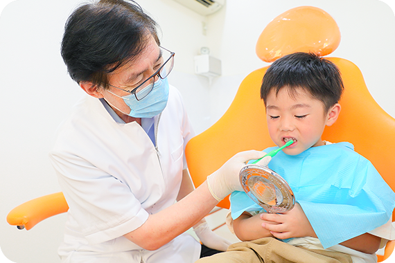 歯科医院で治療を受けることに対して、不安を感じるお子さんは多くいます。当院ではできる限りマイナスイメージを持たないよう、Tell・Show・Doやシェイピング法を導入した治療を行っています。診療器具や診察台に少しずつ慣れてもらうところから始めて、歯科医院が怖くないところと認識してもらうよう努めております。